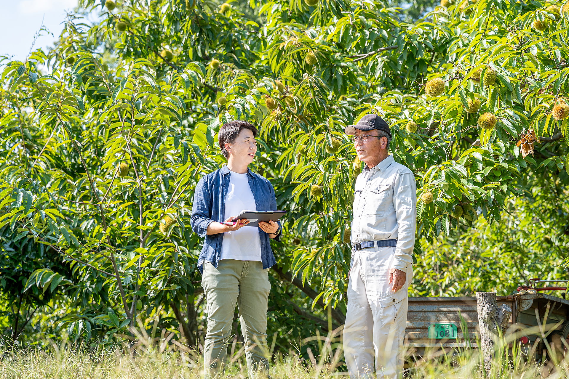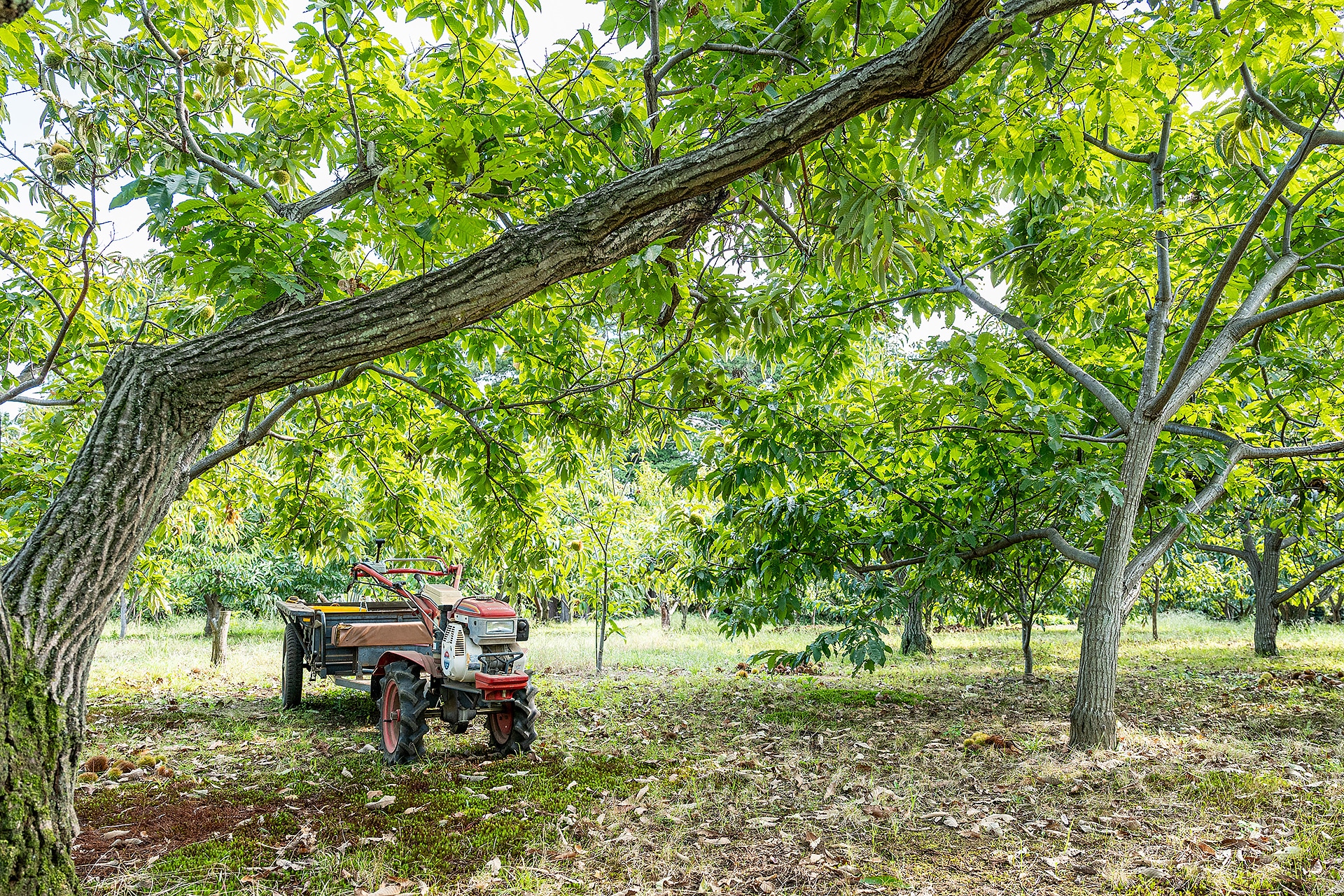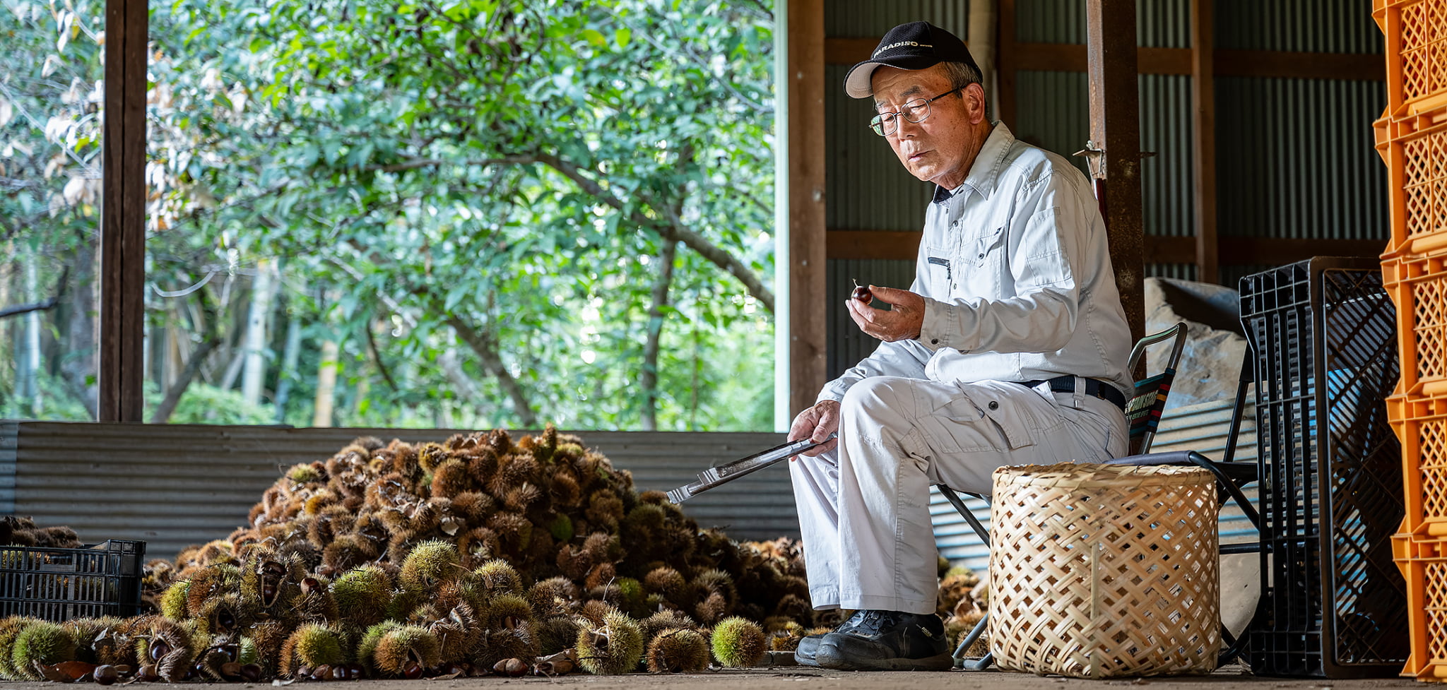 志村さんの栗畑や栗はとても美しい。栗のイガは畑でまとめられ、葉は適度な間隔で風にそよぎ、木が喜んでいるように見える。「栗の収穫は朝。熟して落ちた実を、日差しが強くなる前に拾うんだよ」と志村さん。栗は光にさらされると変色してしまうため、鮮度を守る工夫が欠かせない。栗は木からもがず、自然に落ちた実を収穫するのが基本。午前中の栗拾いから午後の選別、保管、出荷まで、一粒ずつ手と目で確かめながら妥協のない作業が続く。木や実をじっと見つめるその姿からは、栗への深い愛情と、栗を心待ちにするお客様への想いが伝わってきた。
