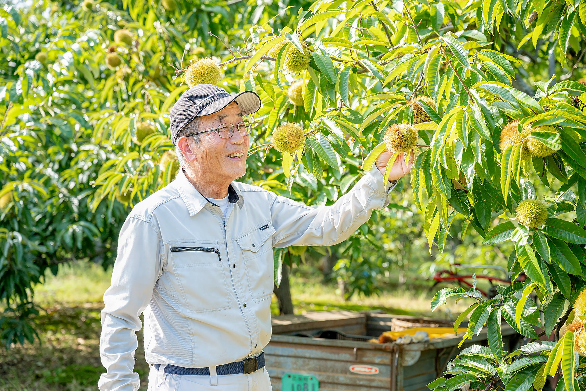 熊谷市南部の江南地区一帯は緩やかな丘陵地が広がり果樹などの生産が多いエリア。「水はけのよい土壌が特徴で栗栽培には適した場所」と語るのは江南栗生産出荷組合に所属する志村武さん。「特別、栗が好きというわけではなかったんですよ」と笑う志村さんだが、両親の代から受け継いだ畑を守るため、18年前に前職を早期退職し本格的に栗栽培に取り組むことを決めた。現在は 1.4ヘクタールの畑に約400本の栗の木を育て、年間1,300kgの栗を出荷している。