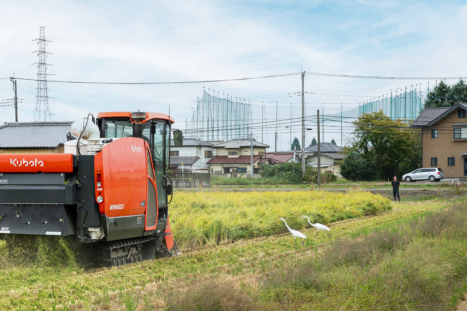 取材時は、ちょうど稲刈りの最盛期。翔太さんが運転するコンバインのあとを、シラサギが追いかけていた。刈り取りで跳ねたカエルを狙っているのだという。
